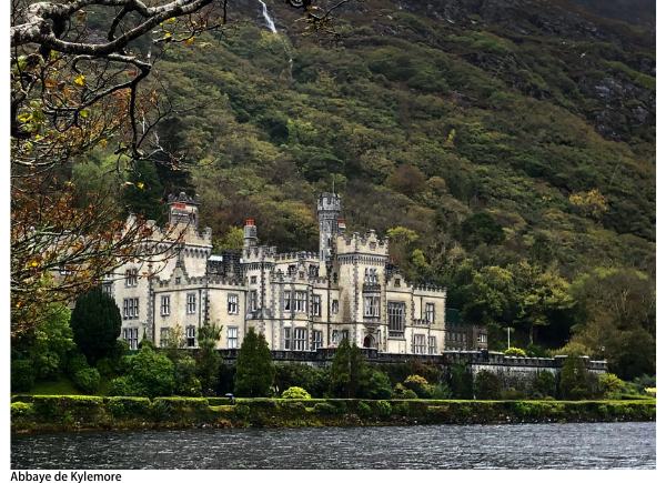 Lundi matin il mouille des cordes et nous partons en direction de l’Abbaye de Kylemore fondée en 1920 sur le site du château du même nom. La région de Connemara que nous traversons est magnifique malgré la pluie, les routes sont étroites (comprendre aucun accotement) sinueuses et propices à l’aquaplanage. Mais peu importe où notre regard se pose, de nombreuses teintes de verts apparaissent! Nous croisons de nombreux troupeaux de moutons et ne cessons de nous extasier à chaque rencontre. C’est simplement magique. Nous revenons épuisées pas la route, mais avec de magnifiques images pleins la tête.